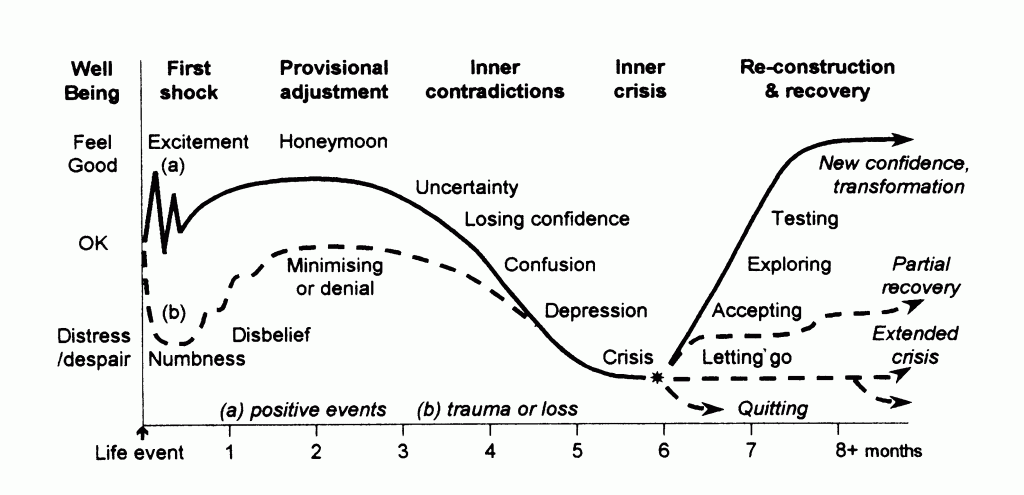 I was recently looking for some resources around managing and understanding change and came across this graph (devised by Adams, Hayes and Hopson in 1976). It plots the phases we might experience when faced with a major life event. The graph plots our possible experience with a positive event and a negative event (for example trauma and loss). What I found fascinating was that regardless of whether the change underway is negative or positive, we may all experience an “inner crisis” before hopefully recovering towards transformation. Whatever the change (be it an engagement or a redundancy) our psyche might be disrupted in similar ways. Change whatever it is, impacts us and represents a challenge to work through.